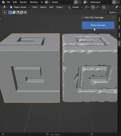 OCD (One Click Damage)是一个非常有用的中文版插件blender附加组件,它使用中文版插件blender来破坏和处理平面和边缘。一个一个地手动处理模型是很困难的,但是有了这个插件,你可以在很短的时间内改变模型的形状。此外,如果第一个对象有 UV,它将保留,OCD 会为受损区域分配新材质。模型本身会发生变化,所以如果你想重新调整它,你需要复制原始模型。中文版插件blender插件使用也非常简单,只需选择模型,单击“Make Damage”,根据自己的喜好调整伤害的数量和数量,然后按“应用”按钮。包含11种噪波类型Musgrave马氏分形,Blend混合,Clouds云絮,Distorted Noise畸变噪波,Image or Movie图像/影片,Magic幻彩,Marble大理石纹,Noise噪波,Stucci斯氏分形,Voronoi沃罗诺伊图,Wood木纹